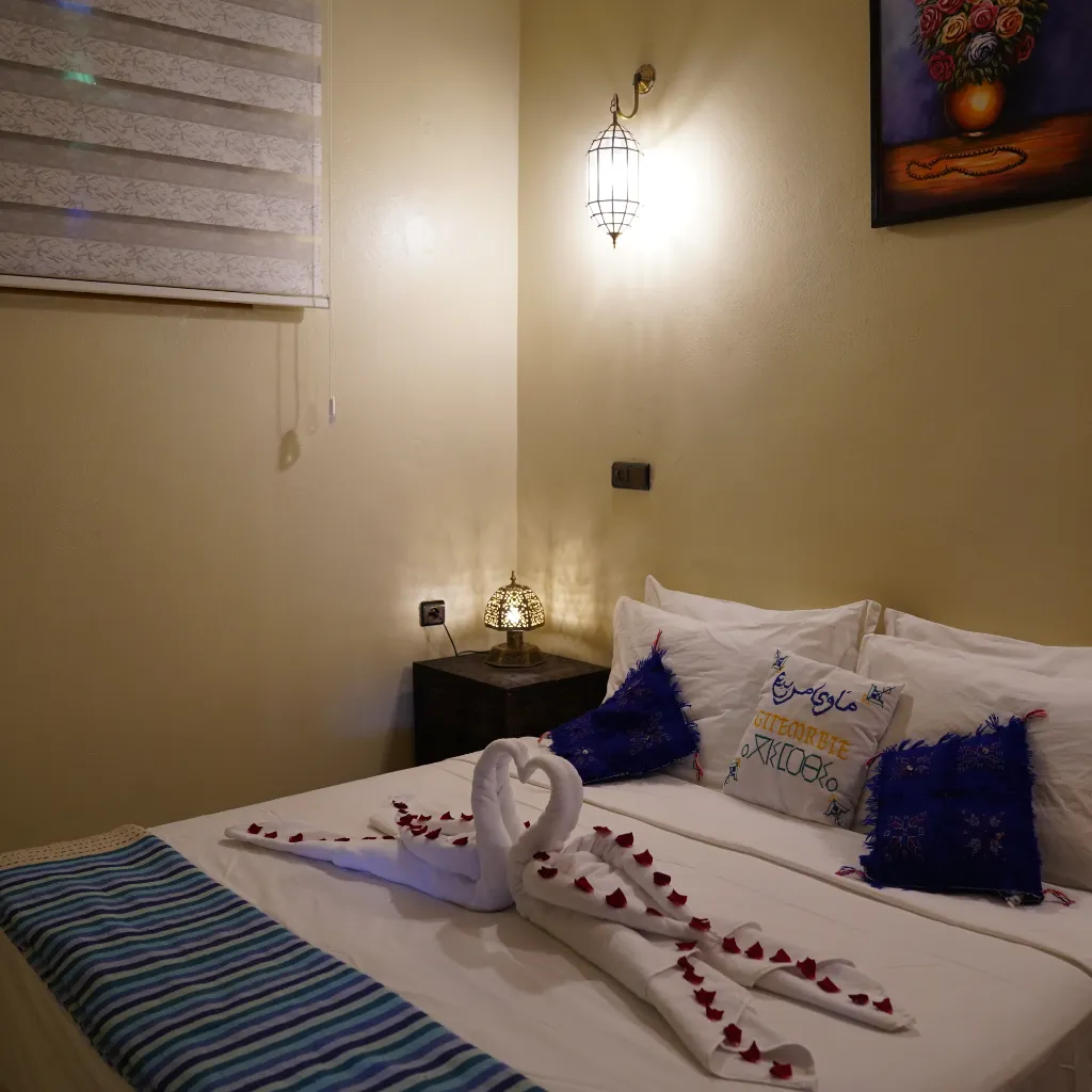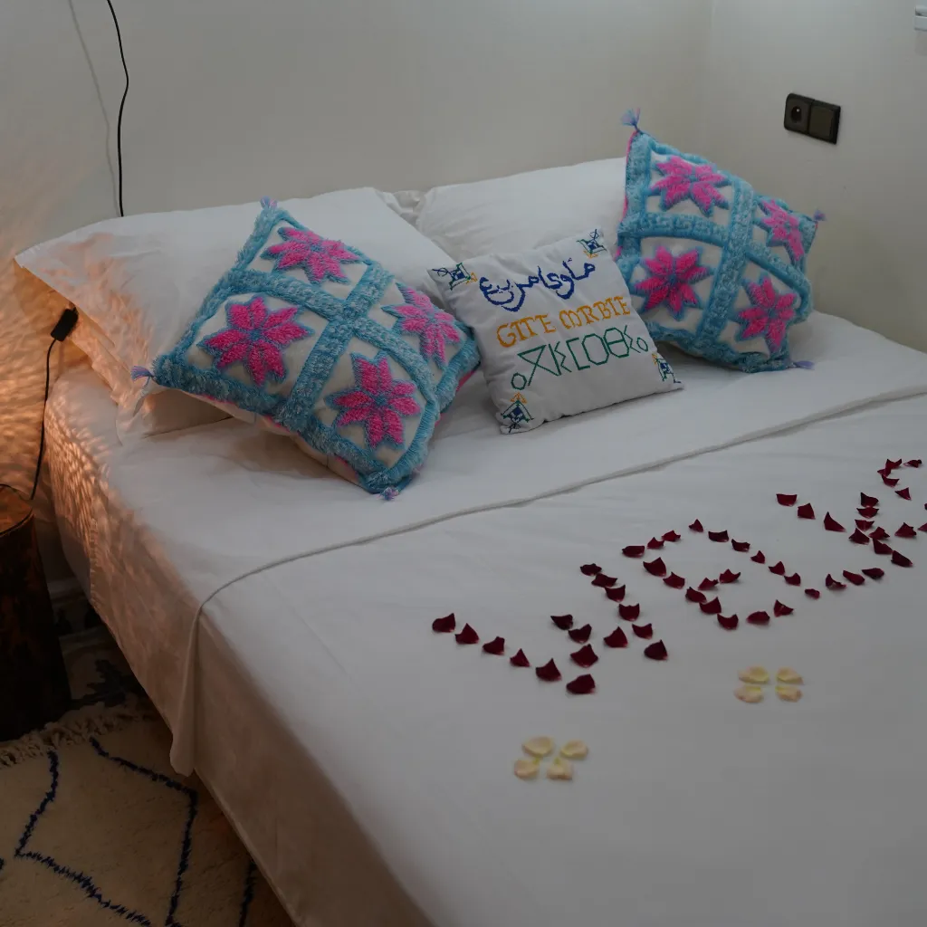 Te invitamos a explorar visualmente nuestros espacios privados. Cada una de las seis habitaciones (Targa Ifrakh, Tazrout, Adraoui, Tihyi, Tibarkanine y Bungalow Inna) ha sido diseñada con materiales y técnicas locales, ofreciendo un refugio tranquilo y acogedor donde la estética Amazigh se fusiona perfectamente con el confort que mereces después de un día explorando el Medio Atlas.